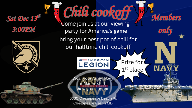 Members come on out and enjoy the Army Navy game and vote for the best chili. Saturday December 13th at 3:00PM